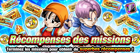 [7e anniv] Termine n'importe quel niveau 1 foisTermine n'importe quel niveau 1 fois ! Cette mission commence tous les jours à 16:00, du 06/07 au 07/08 PST ! Il te suffit de la réussir et de récupérer ta récompense avant 15:59 PST du jour d'après. * Tenkaichi Budokai et Bataille royale exclus.