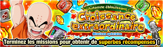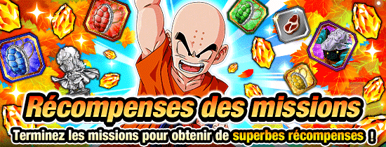 [Automne quotidien] Termine n'importe quel niveau 1 foisTermine n'importe quel niveau 1 fois ! Cette mission commence tous les jours à 16:00, du 05/10 au 19/10 PST ! Il te suffit de la réussir et de récupérer ta récompense avant 15:59 PST du jour d'après. * Tenkaichi Budokai et Bataille royale exclus.