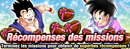 Termine n'importe quel niveau 5 fois ! Cette mission commence tous les jours à 16:00, du 07/02 au 13/02 PST ! Il te suffit de la réussir et de récupérer ta récompense avant 15:59 PST du jour d'après. * Tenkaichi Budokai et Bataille royale exclus.