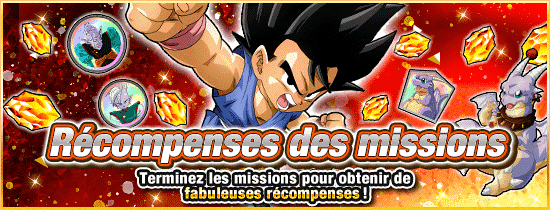 Termine n'importe quel niveau 2 fois ! Cette mission commence tous les jours à 16:00, du 31/12/2023 au 30/01/2024 PST ! Il te suffit de la réussir et de récupérer ta récompense avant 15:59 PST du jour d'après. * Tenkaichi Budokai et Bataille royale exclus.