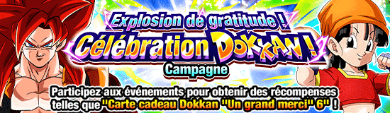 Explosion de gratitude ! Célébration Dokkan ! Campagne en cours ! Récupérez de belles récompenses via le bonus de connexion et les missions !