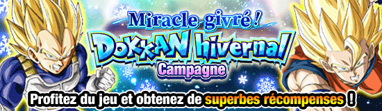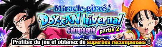 "Miracle givré ! Dokkan hivernal Campagne partie 2" en cours ! Pierres Dragon et autres belles récompenses à obtenir via le bonus de connexion et les missions !